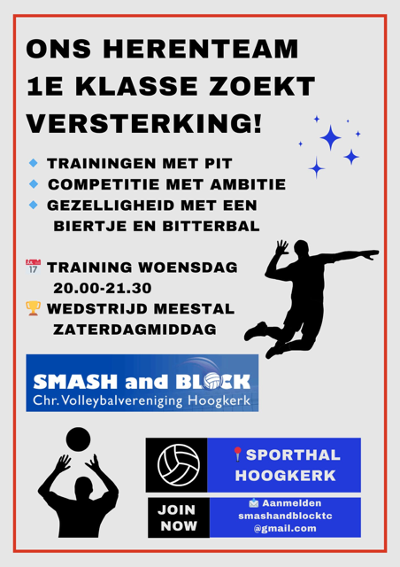 We zijn nog op zoek naar nieuwe leden voor heren 1, en voor onze damesteams. Heb jij zin om mee te doen? Meld je dan nu aan voor een gratis proeftraining via smashandblocktc@gmail.com.