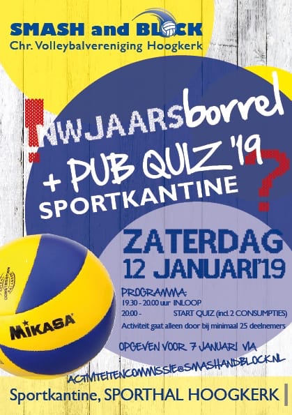 Op zaterdag 12 januari is de nieuwjaarsborrel van Smash & Block! Een mooi moment om alle leden een gelukkig nieuwjaar te wensen met een leuke pubquiz!