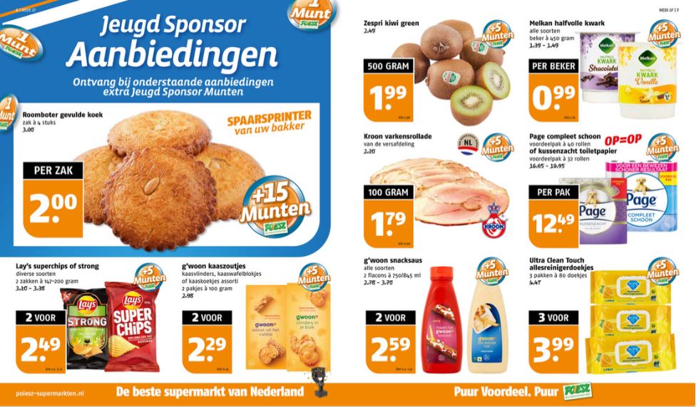 Jeugd Sponsor Munten krijg je gratis bij de kassa van alle Poiesz supermarkten. Bij iedere € 10,- aan boodschappen krijg je een munt. Je krijgt extra munten bij aankoop van een sponsorproduct of een speciale jeugd sponsor weekaanbieding (1, 5 of 15 extra munten!). Zo spaar je extra snel!