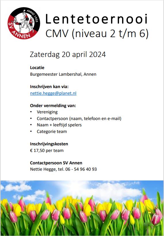 Op zaterdag 20 april is er een CMV-toernooi in Annen. Voor meer informatie kun je terecht bij Nettie.