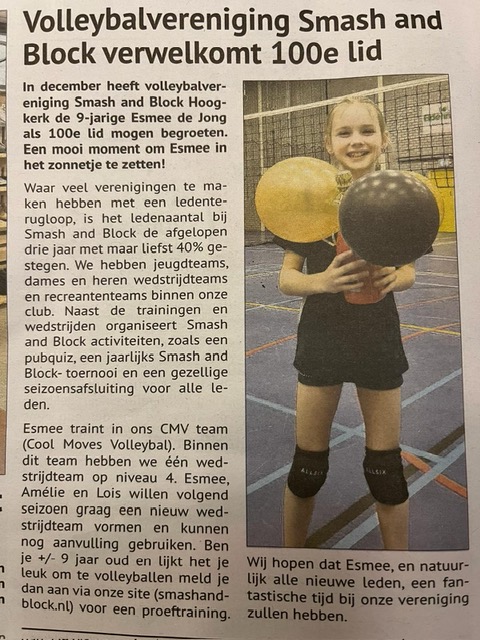 In december heeft volleybalvereniging Smash and Block Hoogkerk de 9-jarige Esmee de Jong als 100e lid mogen begroeten. Een mooi moment om Esmee in het zonnetje te zetten!