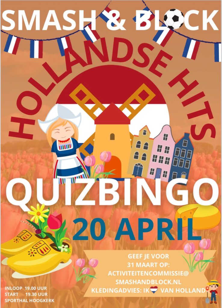 Op zaterdag 20 april organiseert de activiteitencommissie voor alle senioren en meisjes A de enige echte Smash and Block Hollandse Hits Quizbingo! Trek je ‘ik houd van Holland’ outfit aan en dan bouwen we er een mooi feestje van!