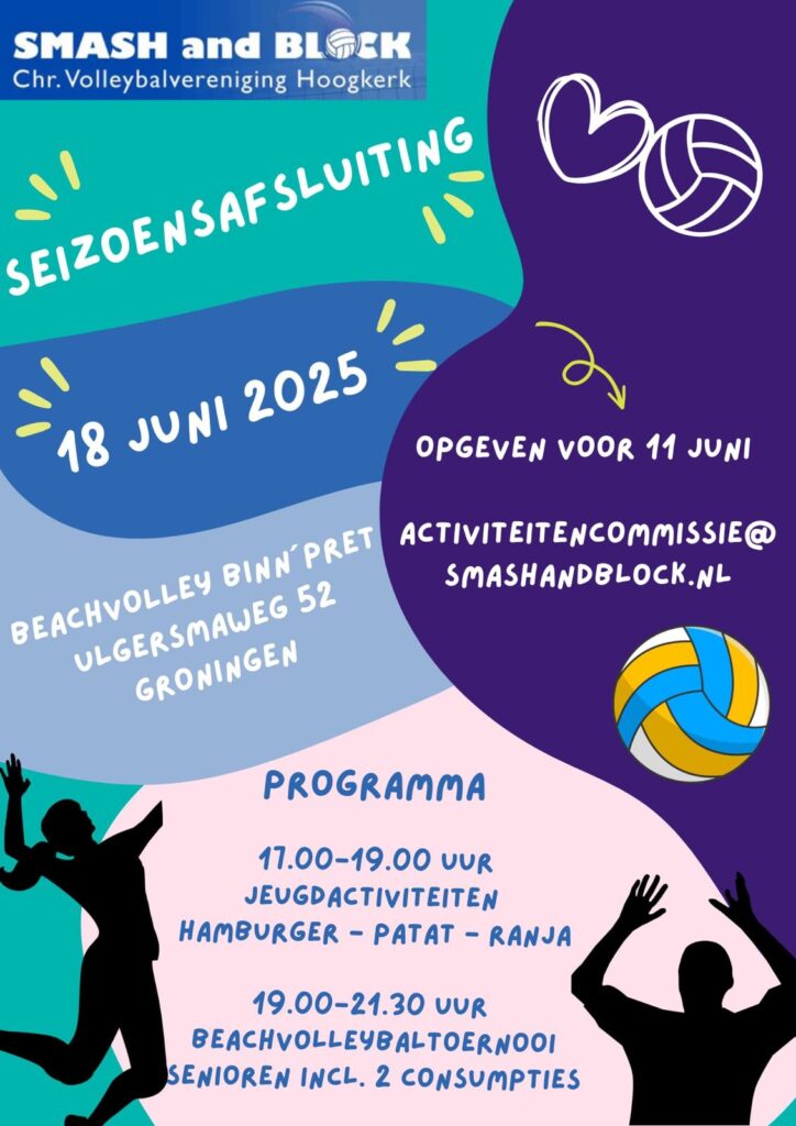 De laatste training van dit seizoen is op woensdag 11 juni. Maar niet getreurd, op 18 juni is dus nog de seizoensafsluiting! Het nieuwe seizoen start in de week na de schoolvakanties, op woensdag 27 augustus. In de enquêtes hebben we de meesten van jullie aangegeven ook volgend seizoen te willen blijven volleyballen bij Smash and Block. Dat is natuurlijk top en dan hoef je niks te doen. Wil je je afmelden voor komend seizoen? Dat zouden we heel jammer vinden, maar dat kan natuurlijk ook. Vul dan het afmeldformulier van de website in en stuur die vóór 15 juni naar ledenadministratie@smashandblock.nl. Dan kunnen we jou op tijd afmelden bij de Nevobo. Meld je je na 15 juni af, dan ben het seizoen erna nog contributie en Nevobo-gelden verschuldigd.