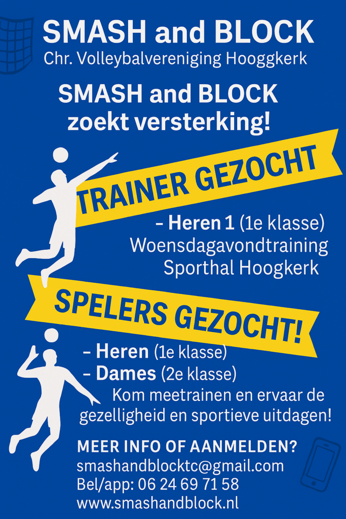 Voor komend seizoen is H1 (1e klasse) nog op zoek naar een nieuwe train(st)er. Lijkt het jou leuk om training te geven of ken je iemand die we hiervoor kunnen benaderen? Meld het dan bij de TC (smashandblocktc@gmail.com)! De trainersvergoeding is € 9 per uur (met VT2-licentie: € 10 per uur). Zo kun je dus mooi wat bijverdienen.